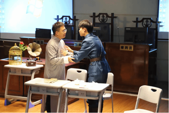 拂晓剧社成员承演,曾在校“两赛”小品小戏专场荣获优秀剧目奖。通过沉浸式红色教育,引导新生传承红色基因。